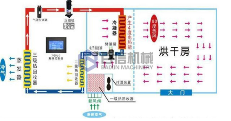 2、采用回熱循環熱泵除濕方式,拓寬了除濕機在工業干燥領域的應用,干燥性能比普通熱泵除濕干燥節能30%以上,大大節約運行費用;
