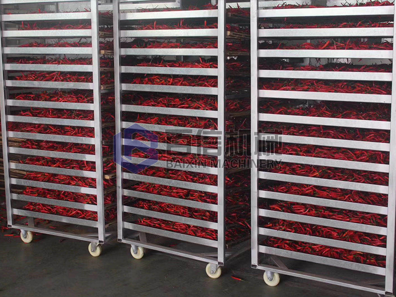 3、二次烘干階段:為保證成品辣椒干貨的品質,此階段需要辣椒鋪料均勻,堆放不可太厚,保證良好的透氣性,設置溫度在60~70℃,時長在6~8個小時即可。